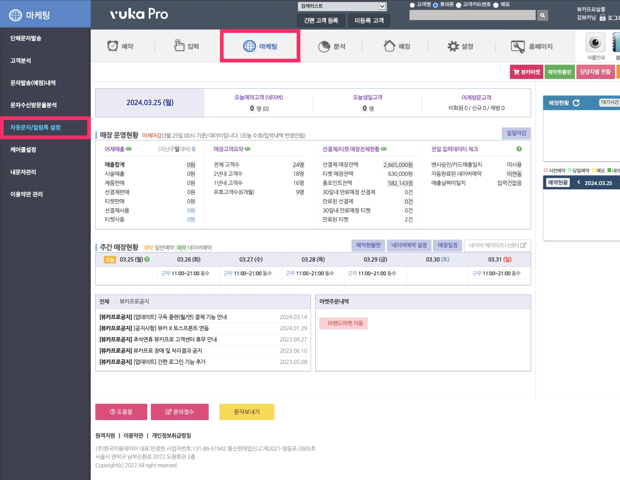 PC 버전 접속 후 상단 카테고리 내 [마케팅] 탭 > [자동문자/알림톡 설정]을 클릭해 주세요.