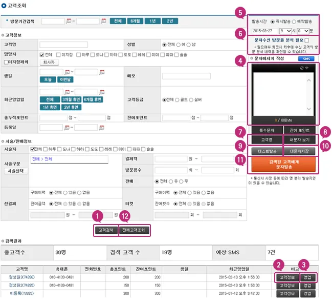 ●고객을 조회조건에 맞게 조회하고 검색된 고객에게 문자를 발송하는 화면입니다.