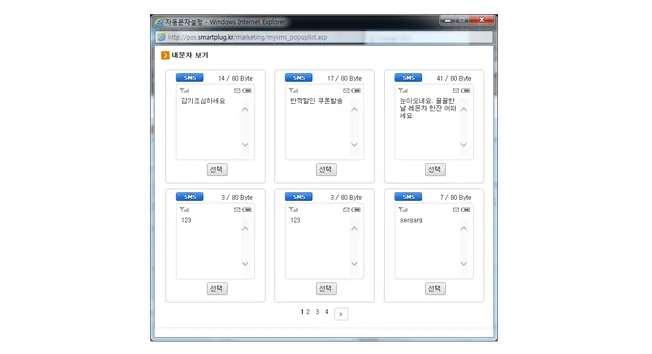 8. 내문자보기 버튼을 클릭하면 내문자보기 팝업이 제공되고 저장해 두었던 내 문자를 선택하여 빠르게 문자의 내용을 입