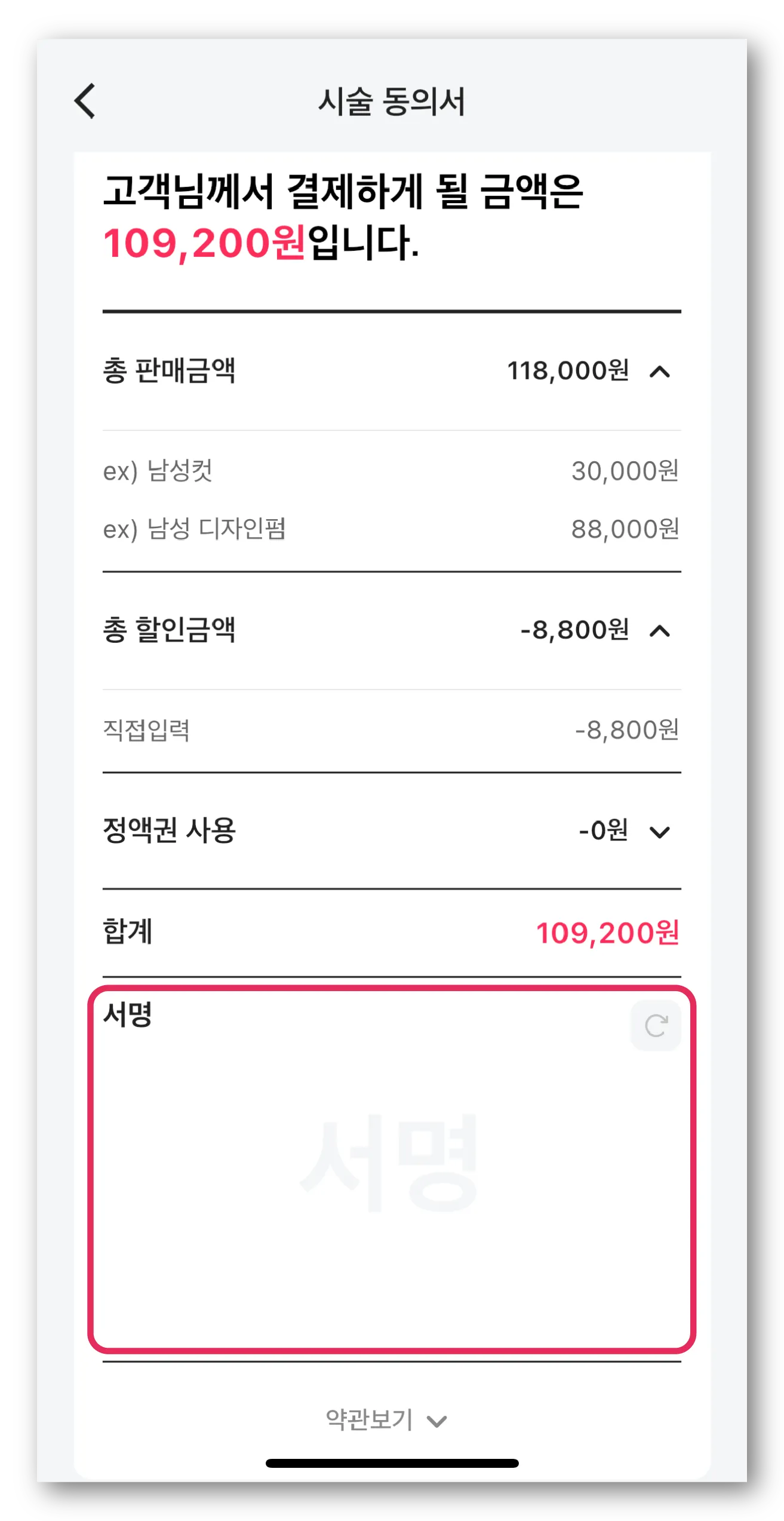 시술 동의서에 등록된 총 금액을 확인 후 고객에게 서명을 받고 ‘시술 시작’ 버튼 눌러주세요.