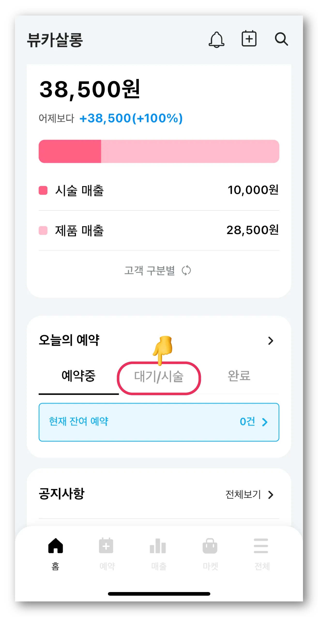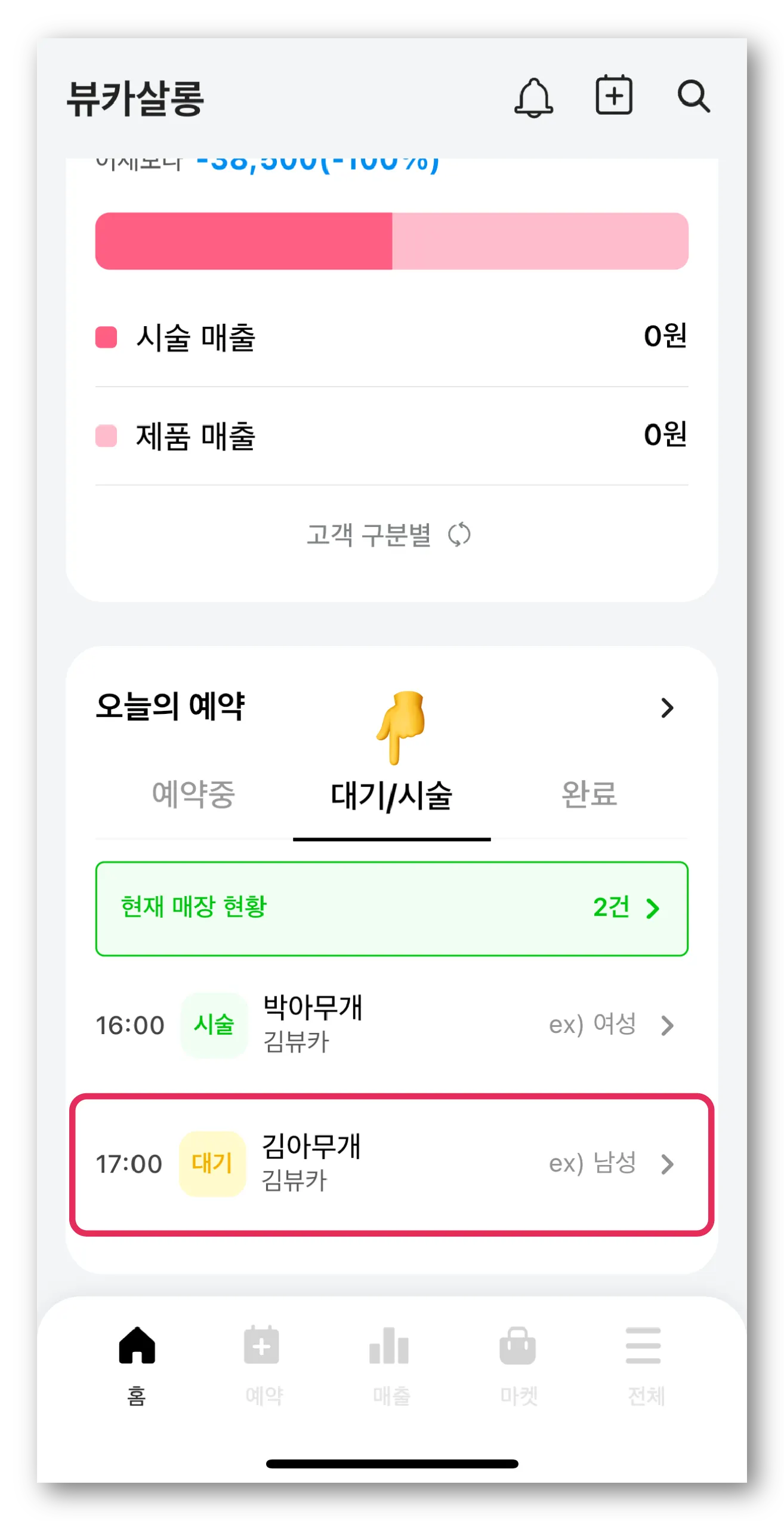 뷰카 홈 화면 ‘오늘의 예약’ 항목에서 ‘대기/시술’ 탭을 눌러 시술을 진행할 고객을 선택해 주세요.
