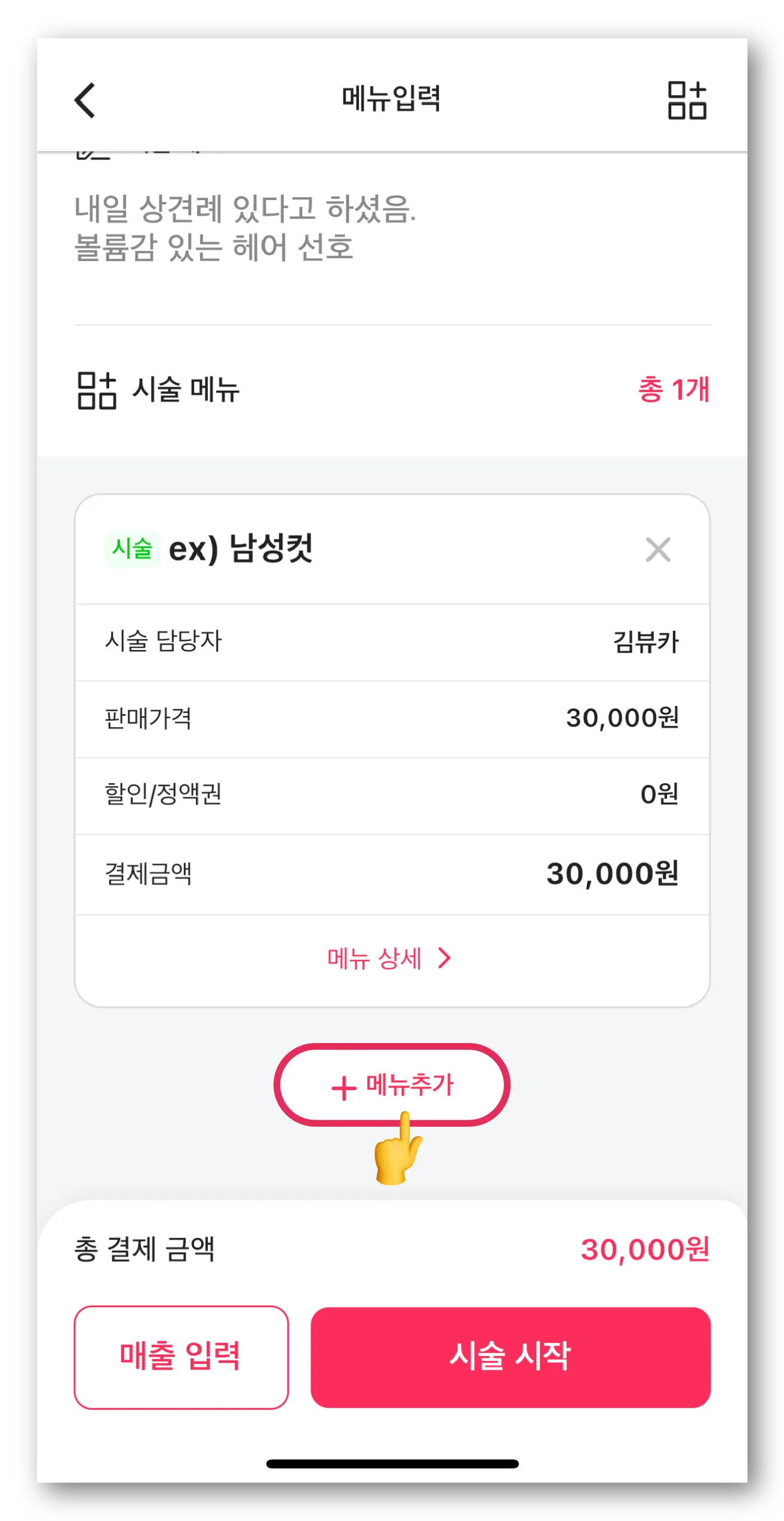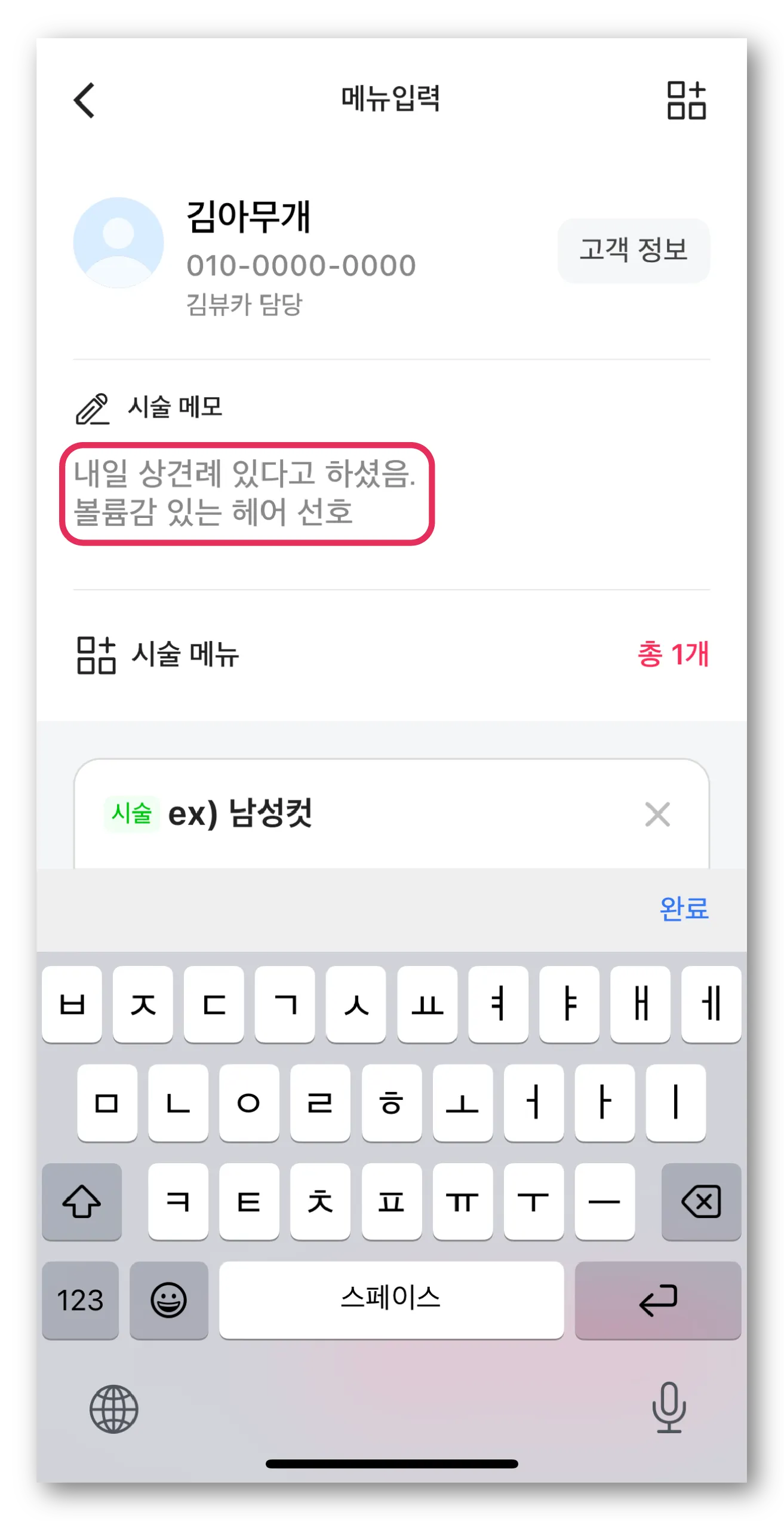 메뉴 입력 화면에서 고객 정보와 시술 메뉴를 확인하고 필요시 시술 메모를 작성해 주세요.