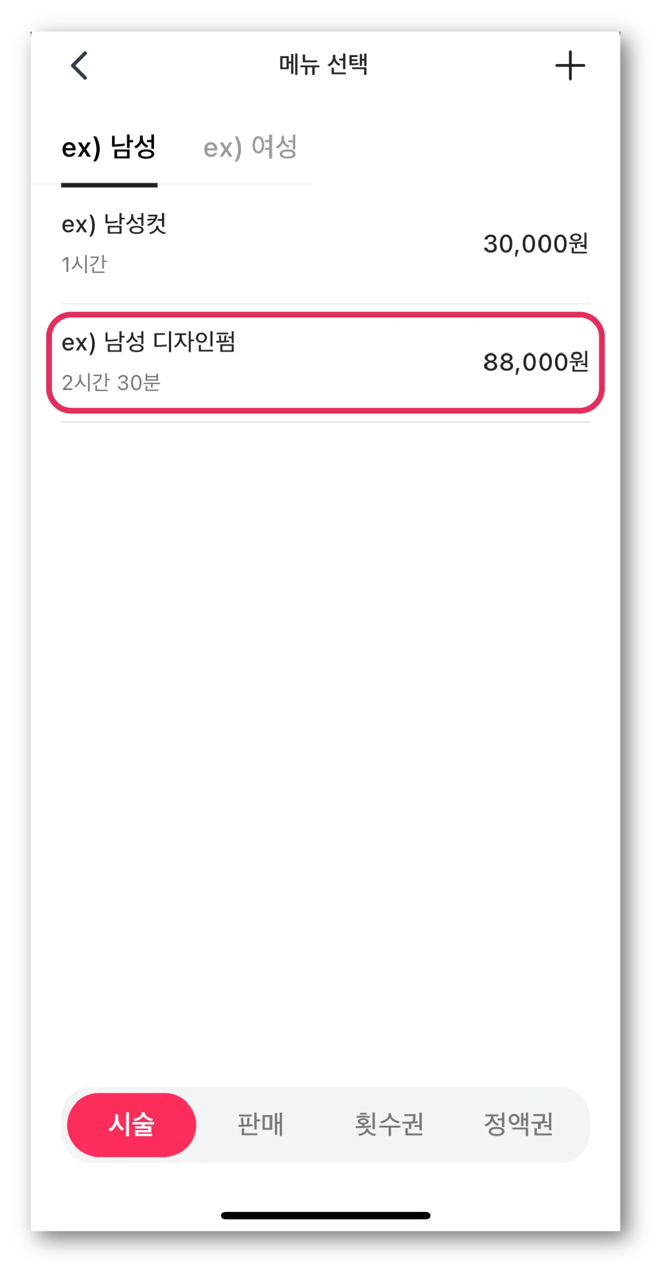 ‘메뉴 추가하기’ 버튼을 누른 후 추가할 시술 또는 제품, 횟수권/정액권을 선택해 주세요.