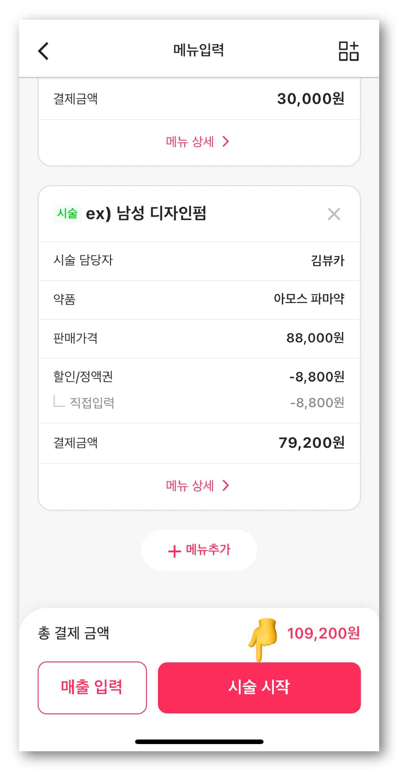 메뉴 입력 화면에서 추가된 시술 메뉴를 확인하고 하단에 ‘시술 시작’ 버튼을 눌러주세요.