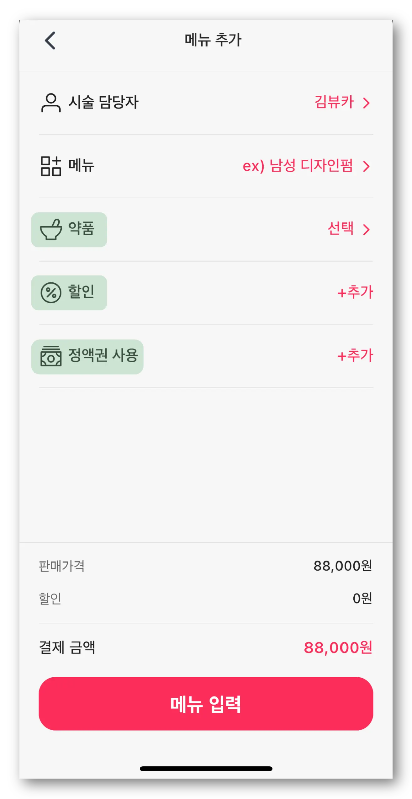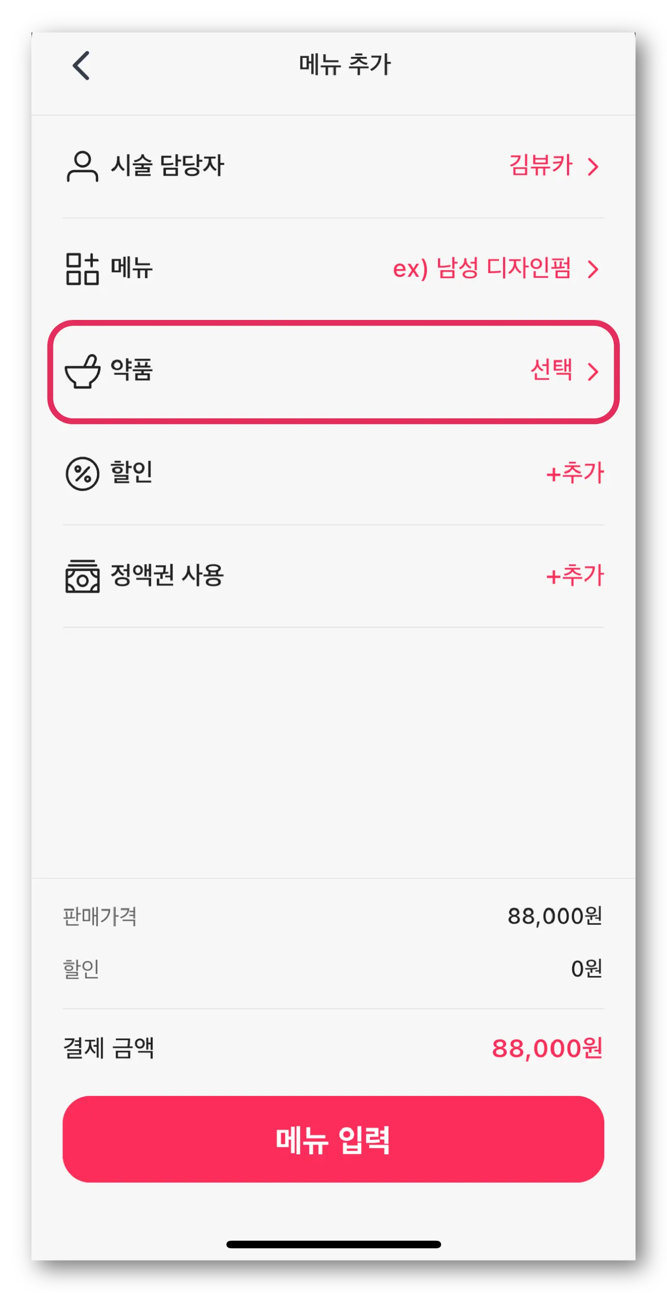 ‘약품/할인/정액권 사용’을 입력했다면 하단의 ‘메뉴 입력’ 버튼을 눌러주세요.