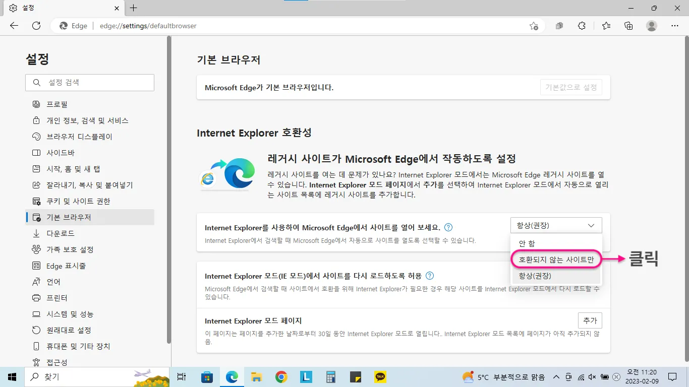 기본 브라우저 설정 화면에서 Internet Explorer 호환성을 변경해 보도록 하겠습니다.