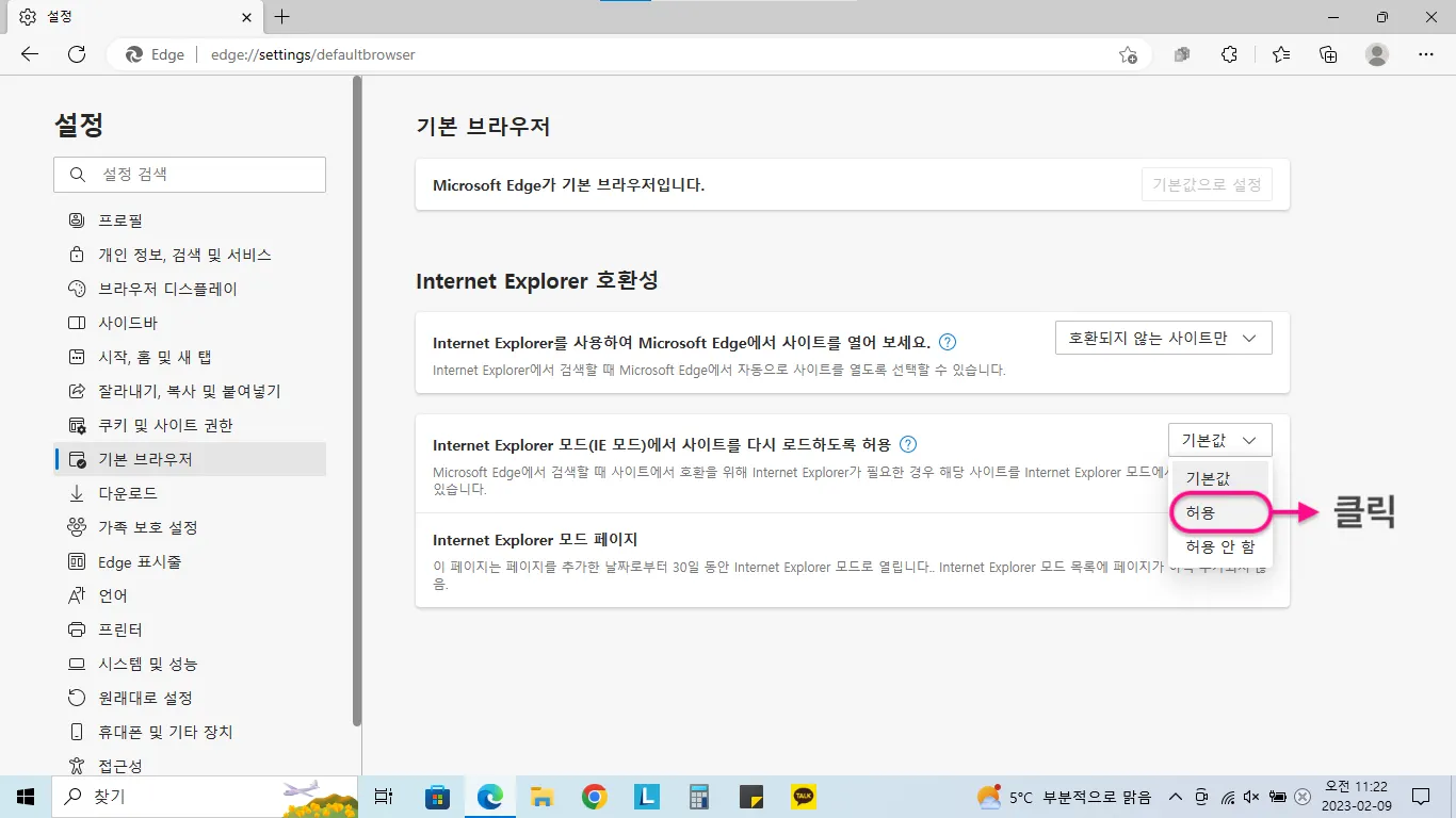 화면을 아래로 내려 Internet Explorer 모드(IE모드) 버튼 항목 우측에 토글 아이콘을 눌러 IE모드를 활성화 해 줍니다.